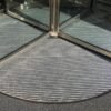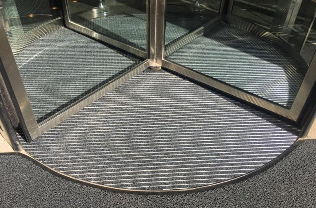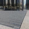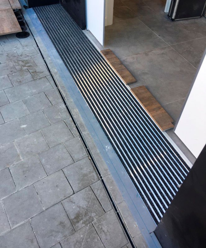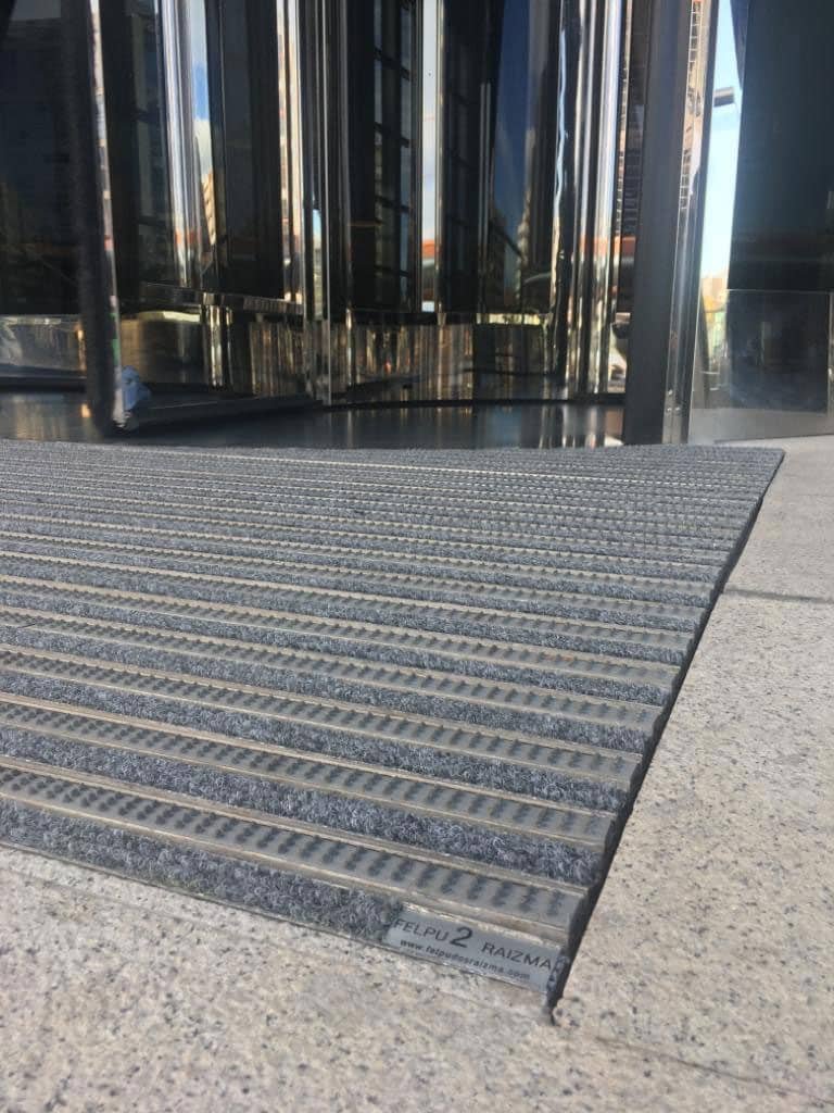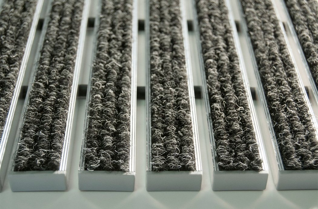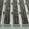 Barrera antisuciedad compuesta por perfiles de aluminio de 10 mm de alto intercalando perfiles de aluminio de 27 mm de ancho, unidos por cable de acero inoxidable y separados por anillos intermedios de caucho que permiten enrollar la alfombra para facilitar su limpieza y transporte. Posibilidad de reemplazar el relleno después de su desgaste. + info