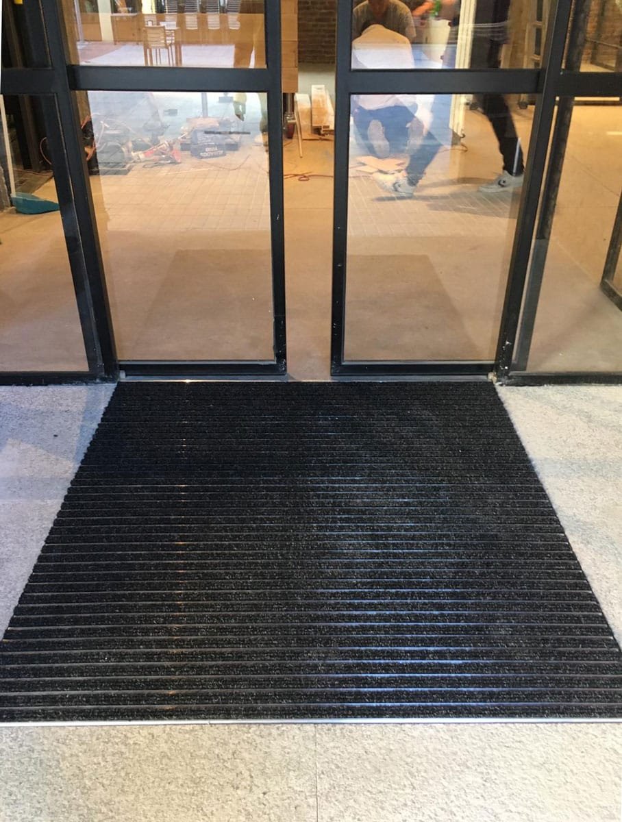 Cuando cientos de personas entran en un edificio un día de lluvia, el suelo del vestíbulo corre peligro. El modelo Olympo Textil actúa como una barrera de secado masiva. Sus inserciones de moqueta técnica cepillan la suela y absorben la humedad instantáneamente, evitando las peligrosas huellas mojadas en el suelo de mármol o granito del interior.